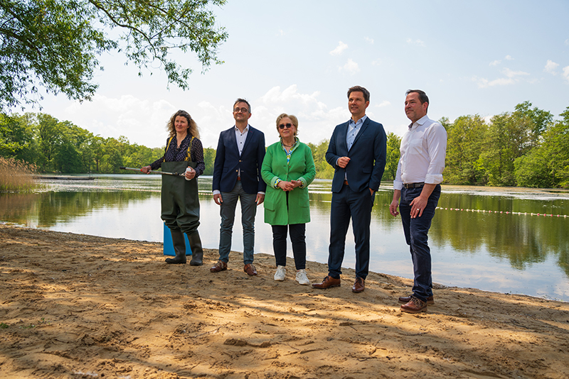 Wenn die Badesaison am Montag startet, können Badegäste guten Gewissens in den ausgewiesenen Seen und Badestellen in der Region Hannover schwimmen gehen. Mit einer symbolischen Wasserprobe am Kirchhorster See in Isernhagen haben heute (12. Mai) Regionspräsident Steffen Krach, Dr. Fabian Feil, Präsident des Niedersächsischen Landesgesundheitsamtes, Isernhagens Bürgermeister Tim Mithöfer und Marlene Graf, Leiterin des Gesundheitsamtes, die Badesaison eröffnet und über die Wasserqualität der Badegewässer in der Region Hannover und in der Region Hannover und in Niedersachsen informiert.