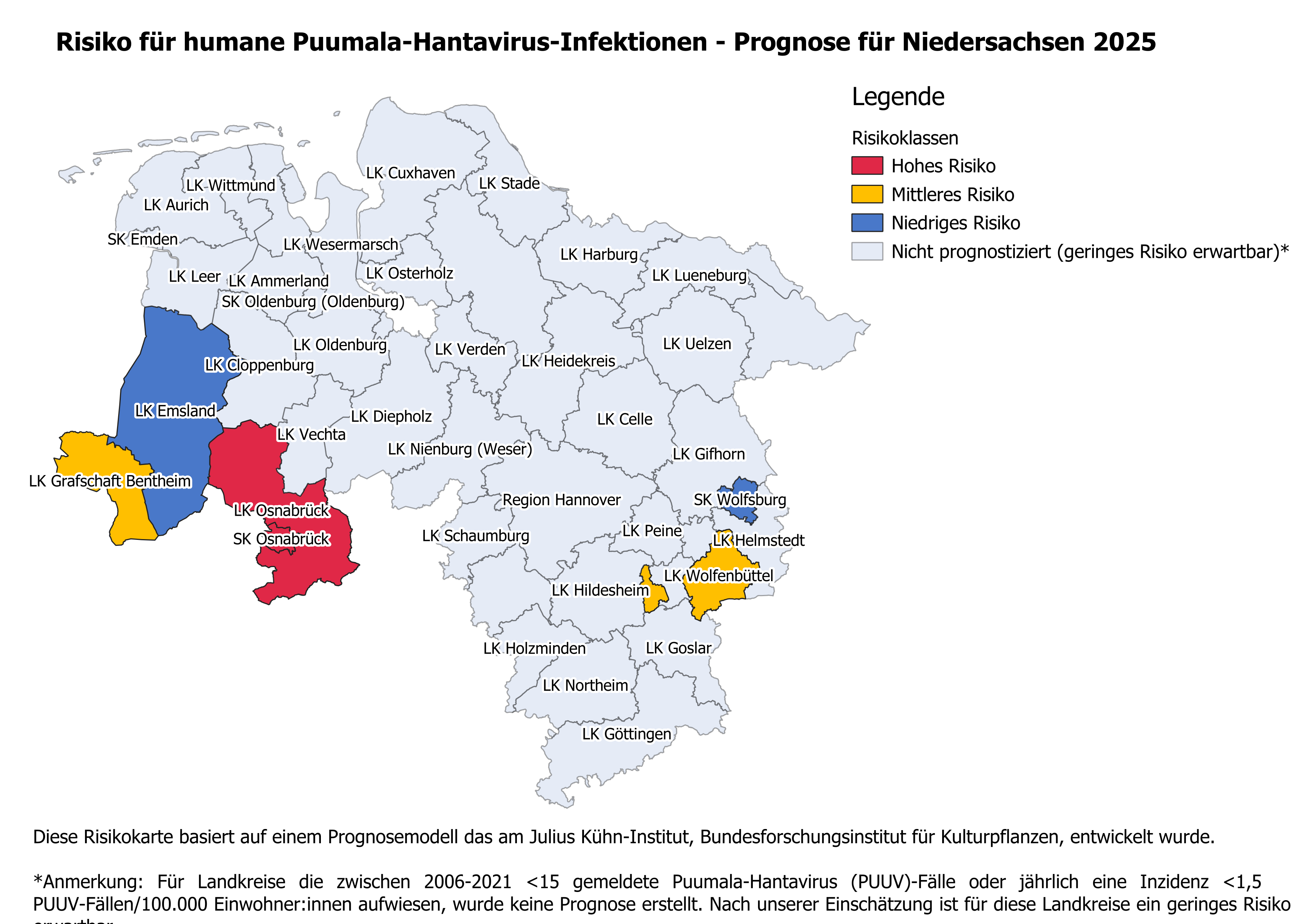 Im Rahmen des RoBoPub-Verbundprojektes hat das Julius Kühn-Institut, das Bundesforschungsinstitut für Kulturpflanzen, ein Prognosemodell für humane Puumala-Hantavirus-Infektionen in Niedersachsen und Nordrhein-Westfalen (NRW) entwickelt. Die folgende Karte stellt die Risikoprognose für Niedersachsen auf Landkreisebene für das Jahr 2024 dar. Die Karte für NRW kann auf der Seite des Landeszentrum Gesundheit Nordrhein-Westfalen eingesehen werden.